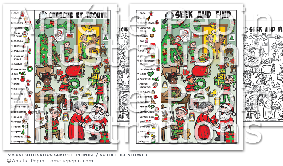 L'enfant cherche et trouve les éléments de la liste dans l'illustration. Les éléments à trouver sont illustrés pour aider l'enfant à apprendre leur nom. C'est un jeu qui développe le sens de l'observation, la concentration et le vocabulaire. L'enfant compte également les éléments jusqu'à neuf. Les lutins du père Noël sont très occupés à l'atelier pour préparer Noël. Une version en noir et blanc est incluse et n'attend qu'à être coloriée!