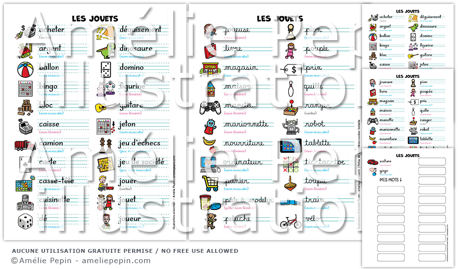 Jouets - Liste de 45 mots illustrés (script et cursif)