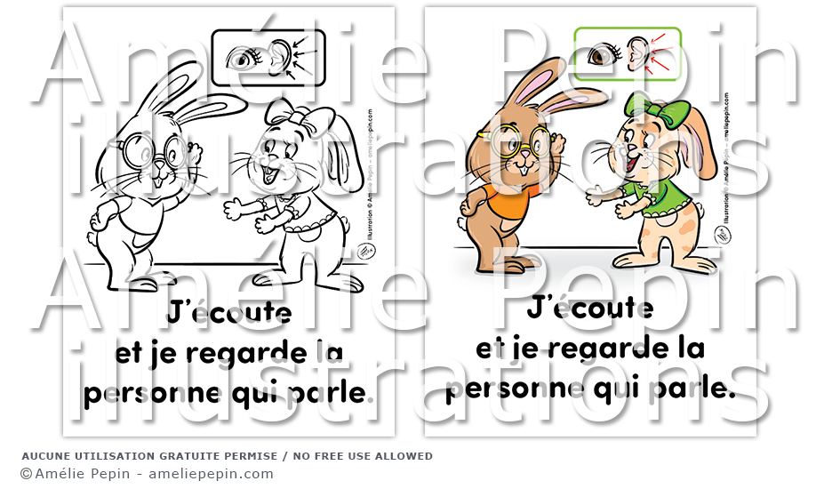 Règle de classe illustrée avec des lapins: "J'écoute et je regarde la personne qui parle."