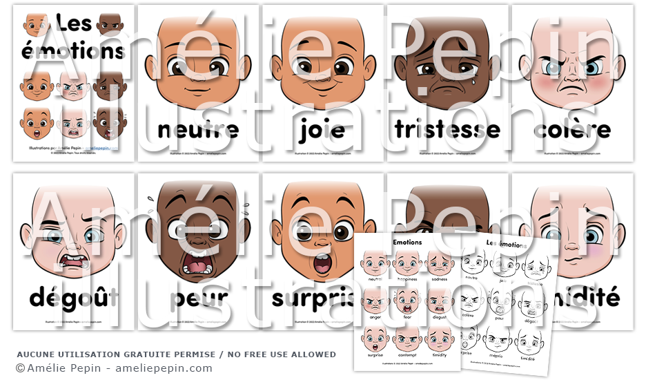 Ces affiches illustrent six émotions universelles ainsi que trois émotions en bonus: neutre, joie, tristesse, colère, dégoût, peur, surprise, mépris et timidité.