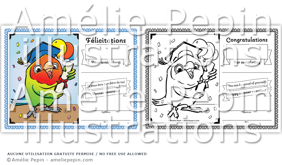 Récompensez la réussite d'une année scolaire complétée avec ce joyeux diplôme d'inséparable! Les informations à compléter doivent être écrites à la main.