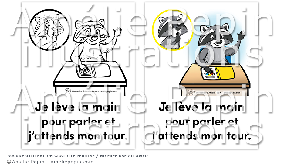 Règle de classe illustrée avec un raton laveur assis au bureau: "Je lève la main pour parler et j'attends mon tour."