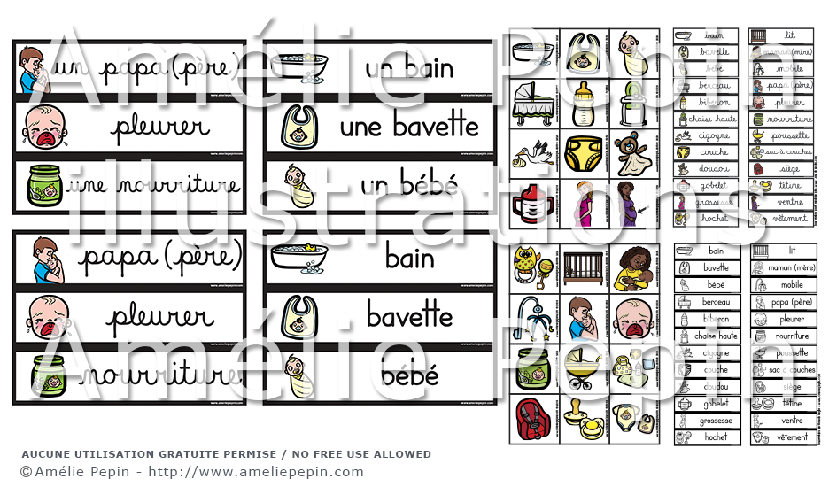 Les mots illustrés sont: bain, bavette, bébé, berceau, biberon, chaise haute, cigogne, couche, doudou, gobelet, grossesse, hochet, lit, maman (mère), mobile, papa (père), pleurer, nourriture, poussette, sac à couches, siège, tétine, ventre, vêtement.