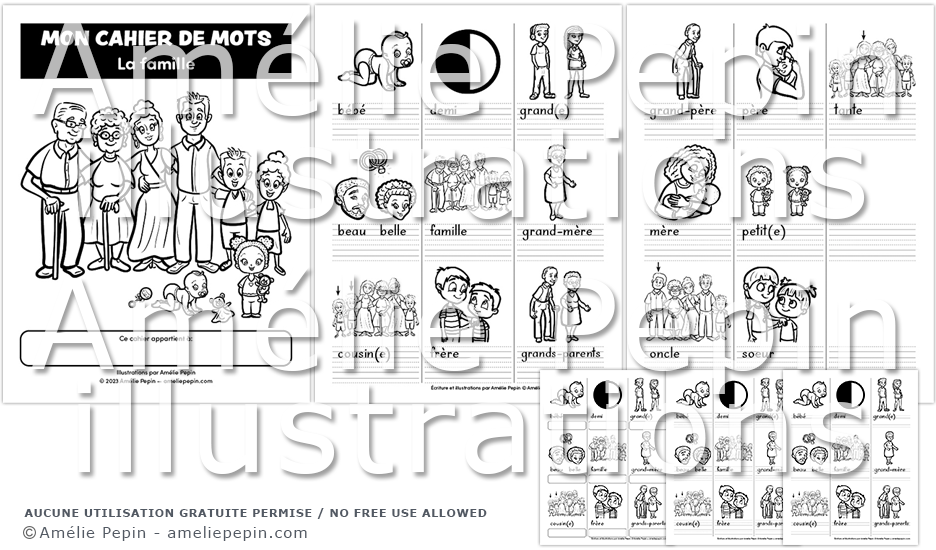 Utilisez ce document en tant que recueil de mots illustrés (dictionnaire) ou comme cahier d'écriture de mots sur le thème de la famille. Les enfants peuvent colorier les dessins. Quatre versions sont incluses: sans ligne (rectangles pour écrire), avec lignes trottoirs, lignes doubles ou lignes calligraphiques.
