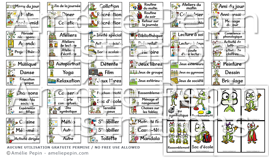 Organisez votre horaire de la journée avec ces étiquettes uniques illustrées au thème des grenouilles. Chaque image permet aux enfants de niveau préscolaire de comprendre rapidement le mot affiché. Une page de grenouilles en version PowerPoint vous permet d'ajouter d'autres étiquettes à celles qui sont proposées. Assurez-vous toutefois d'avoir le logiciel PowerPoint installé sur votre ordinateur. Ces belles petites grenouilles égayeront votre classe!