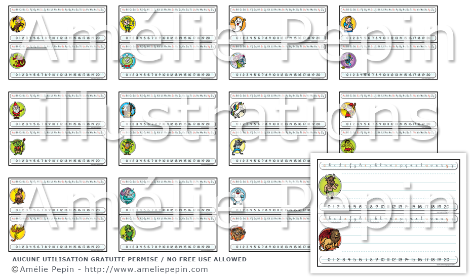Chaque étiquette contient les lettres de l'alphabet en cursive avec les voyelles écrites en rouge, un trottoir pour écrire le prénom de l'enfant ainsi que les nombres de 0 à 20. La version PowerPoint vous permet d'écrire le nom de l'enfant à l'ordinateur (il n'y a pas de trottoir dans cette version). Assurez-vous d'avoir le logiciel Microsoft PowerPoint installé sur votre ordinateur pour ouvrir cette version.
