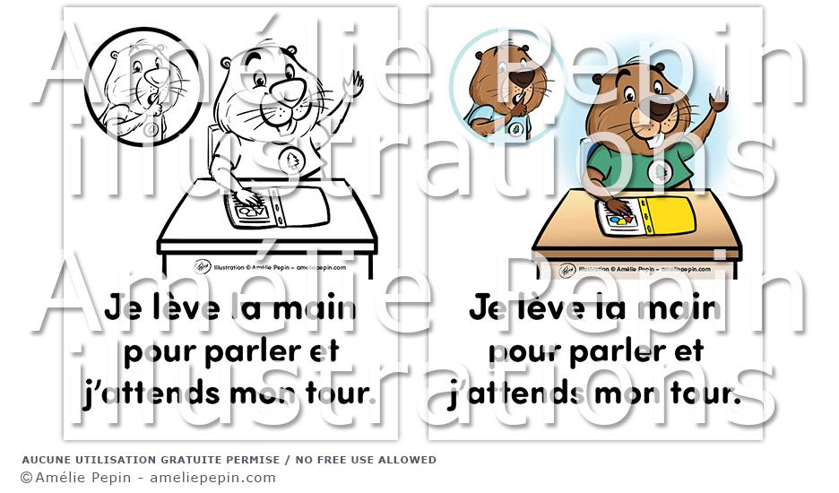 Règle de classe illustrée avec un castor assis au bureau: "Je lève la main pour parler et j'attends mon tour."