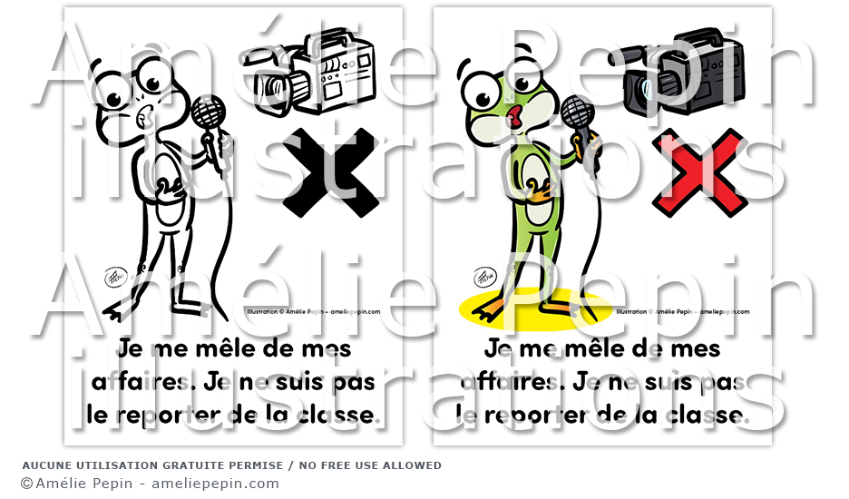 Règle de classe illustrée avec une grenouille: "Je me mêle de mes affaires. Je ne suis pas le reporter de la classe."