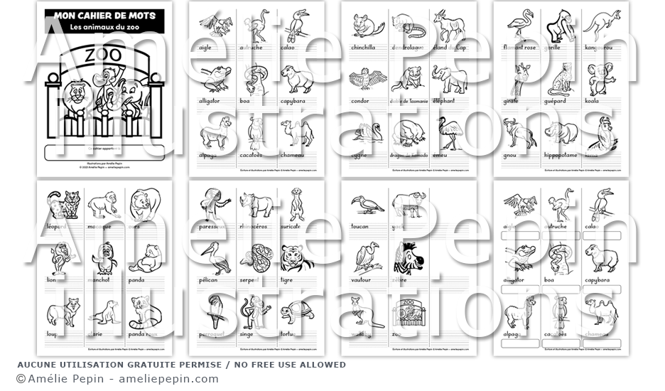 Utilisez ce document en tant que recueil de mots illustrés (dictionnaire) ou comme cahier d'écriture de mots sur le thème des animaux du zoo. Les enfants peuvent colorier les dessins. Quatre versions sont incluses: sans lignes (rectangles pour écrire), avec lignes trottoirs, lignes doubles ou lignes calligraphiques.