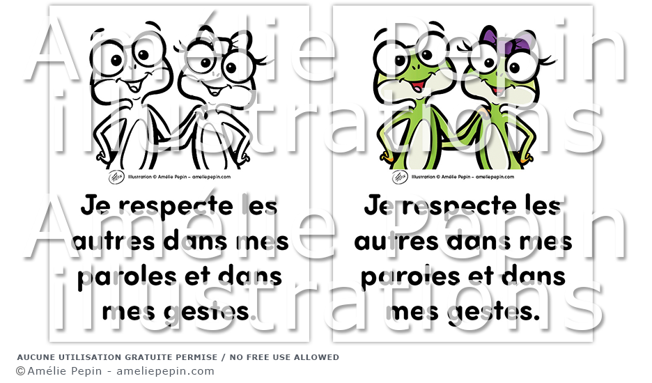 Règle de classe illustrée avec des grenouilles: "Je respecte les autres dans mes paroles et dans mes gestes."