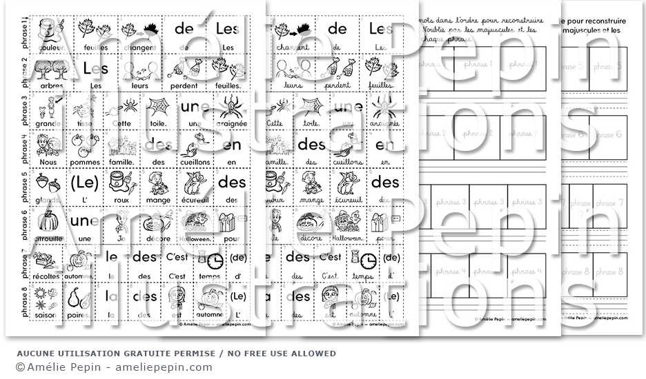 L'enfant découpe les mots illustrés de la page 3 du document (une rangée correspond à une phrase). Il replace les mots en ordre pour former une phrase et il les colle dans les carrés aux pages 1 et 2. Il peut ensuite écrire les phrases obtenues dans les trottoirs (écriture script) ou dans les lignes doubles (écriture cursive). Dans chaque phrase, la lettre majuscule et le point sont indiqués sur les images afin d'aider l'enfant. Les phrases contiennent de 5 à 7 mots.