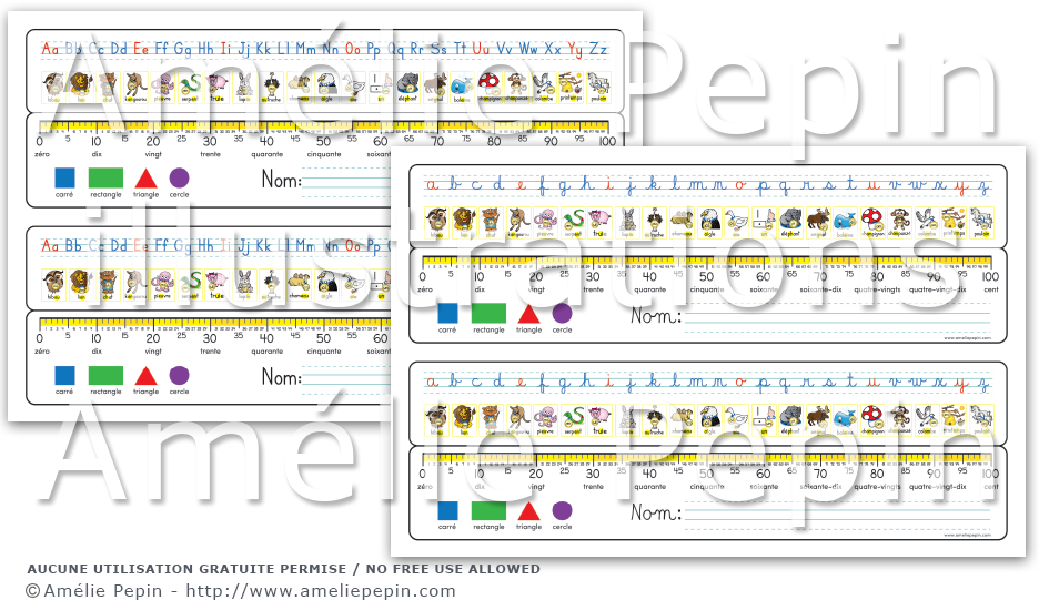 Cet aide-mémoire contient les lettres de l'alphabet avec les voyelles en rouge, les 21 affiches des sons magiques de 1re année, une droite numérique indiquant les nombres de 0 à 100, 4 formes géométriques ainsi que des trottoirs pour que l'enfant y inscrive son nom. Pour la version en écriture cursive, l'alphabet contient les lettres minuscules seulement. La version en écriture script contient les lettres majuscules et minuscules.