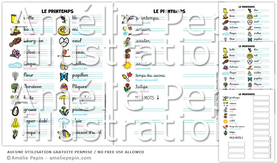 Liste de mots pour apprendre le vocabulaire en lien avec le printemps (29 mots sont illustrés). La classe de mots est écrite entre parenthèses sous chaque mot. Quatre versions sont incluses: sans ligne, avec lignes trottoirs, avec lignes doubles ou avec lignes calligraphiques. Quelques espaces sont prévus à la fin du document afin que l'enfant puisse s'exercer à écrire les mots de son choix. Vous pouvez utiliser cet ouvrage comme petit dictionnaire.