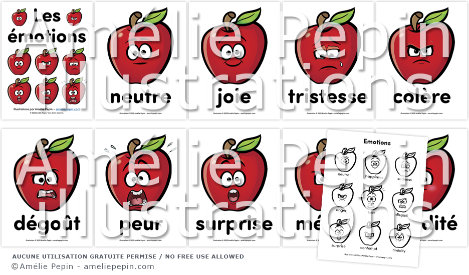 Ces affiches illustrent six émotions universelles ainsi que trois émotions en bonus: neutre, joie, tristesse, colère, dégoût, peur, surprise, mépris et timidité.