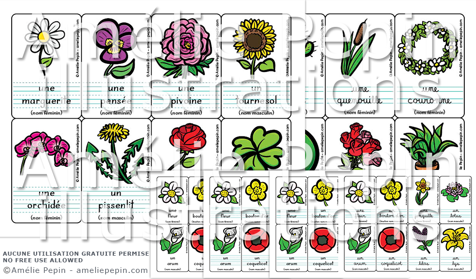 Cartes de mots illustrés pour apprendre le vocabulaire en lien avec les fleurs (24 mots sont illustrés). Sur chaque carte se trouve une illustration, le mot avec le déterminant (lorsqu'il s'agit d'un nom), ainsi que la classe de mots. Quatre versions sont incluses: sans ligne, avec lignes trottoirs, avec lignes doubles ou avec lignes calligraphiques. Choisissez entre l'écriture script ou cursive. Cet outil permet de créer plusieurs activités de francisation pour votre classe ou vos enfants!