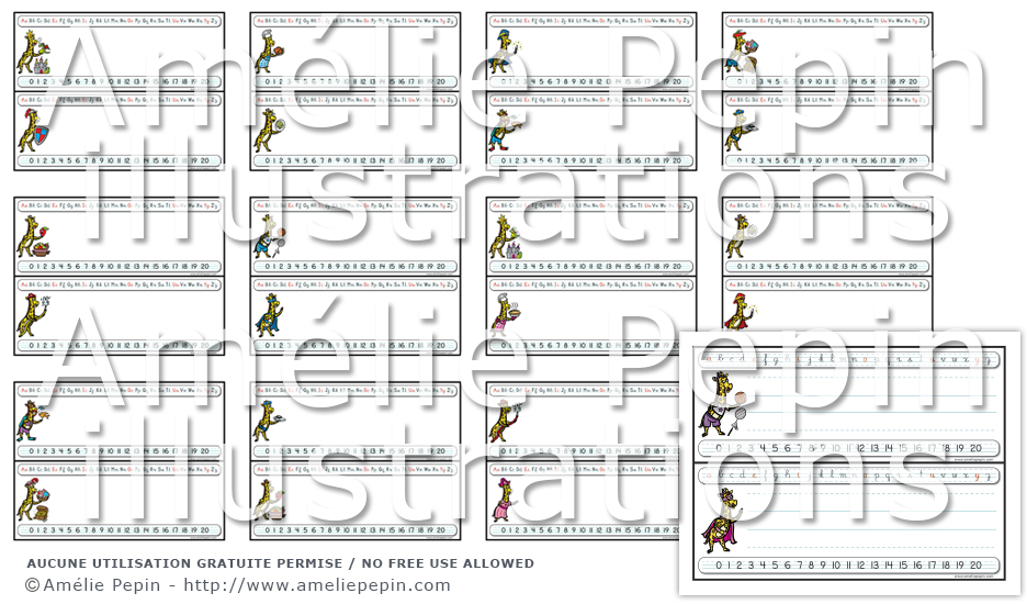 Chaque étiquette contient les lettres de l'alphabet en cursive avec les voyelles écrites en rouge, un trottoir pour écrire le prénom de l'enfant ainsi que les nombres de 0 à 20. La version PowerPoint vous permet d'écrire le nom de l'enfant à l'ordinateur (il n'y a pas de trottoir dans cette version). Assurez-vous d'avoir le logiciel Microsoft PowerPoint installé sur votre ordinateur pour ouvrir cette version.