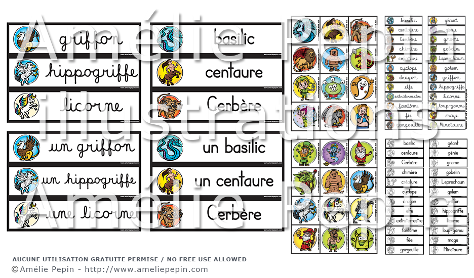 Les mots illustrés sont: basilic, centaure, Cerbère, chimère, créature, cyclope, dragon, elfe, extraterrestre, fantôme, fée, gargouille, géant, génie, gnome, gobelin, Leprechaun, golem, griffon, hippogriffe, licorne, loup-garou, mage, Minotaure, monstre, ogre, Pan, Pégase, phénix, sirène, sorcière, troll, vampire, yéti, zombie.