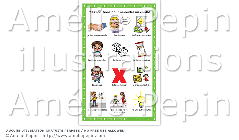 Cette affiche est en lien avec les gestes de réparation. Elle présente 12 stratégies de résolution de conflits illustrées: je fais un compromis, je m'excuse, je répare mon erreur, j'écris ou je dessine, je tire au sort, j'attends mon tour, je partage, je laisse tomber, je change d'activité, je respecte les règles, je demande l'aide d'un adulte, j'ai une autre solution.