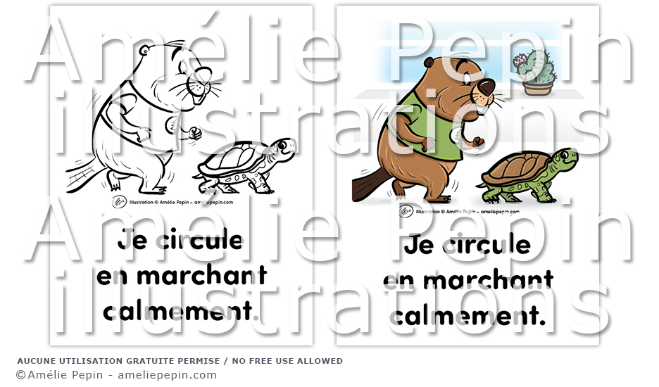 Règle de classe illustrée avec un castor et une tortue: "Je circule en marchant calmement."