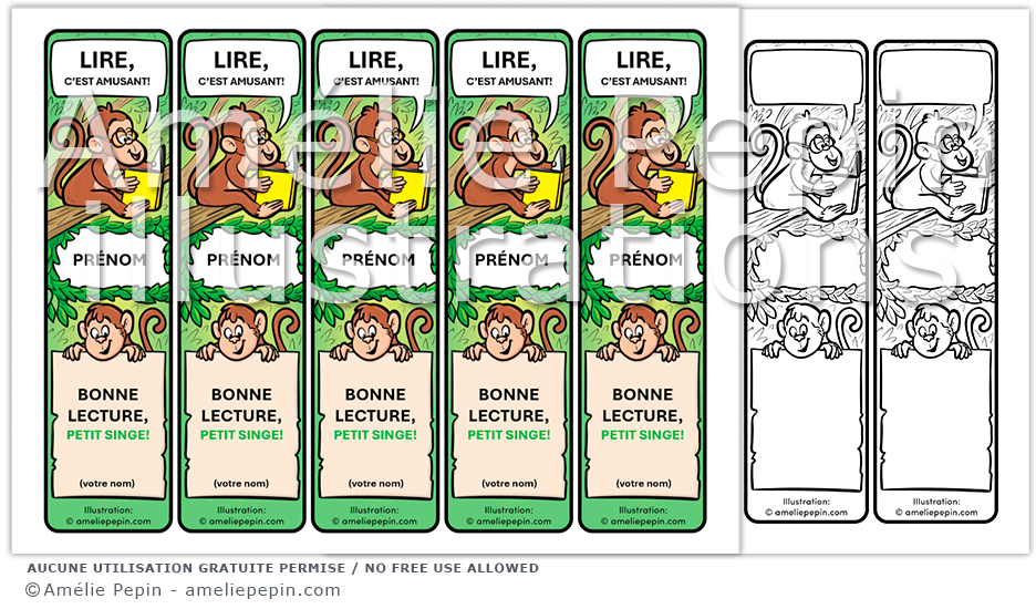 Signets aux coins arrondis illustrés avec un singe assis sur un arbre qui lit un livre tandis qu'un autre singe souriant tient un écriteau. Les textes suggérés que vous pouvez changer sur le signet sont: «Lire, c'est amusant!» et «Bonne lecture, petit singe!».