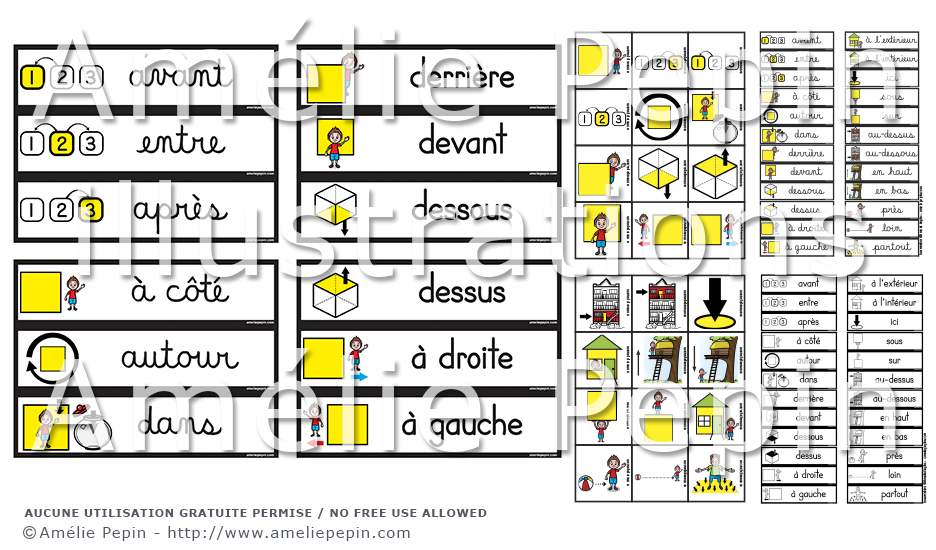Les mots illustrés sont: avant, entre, après, à côté, autour, dans, derrière, devant, dessus, dessous, à droite, à gauche, à l'extérieur, à l'intérieur, ici, sous, sur, au-dessous, au-dessus, en haut, en bas, près, loin, partout.