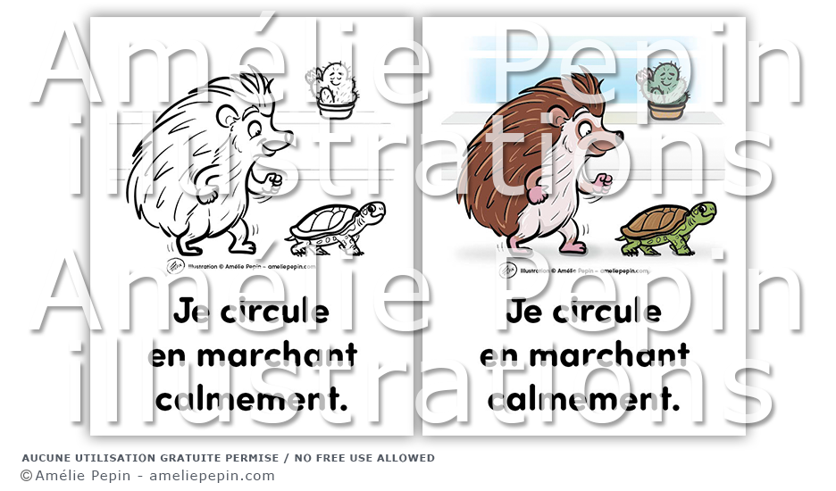 Règle de classe illustrée avec un hérisson et une tortue: "Je circule en marchant calmement."
