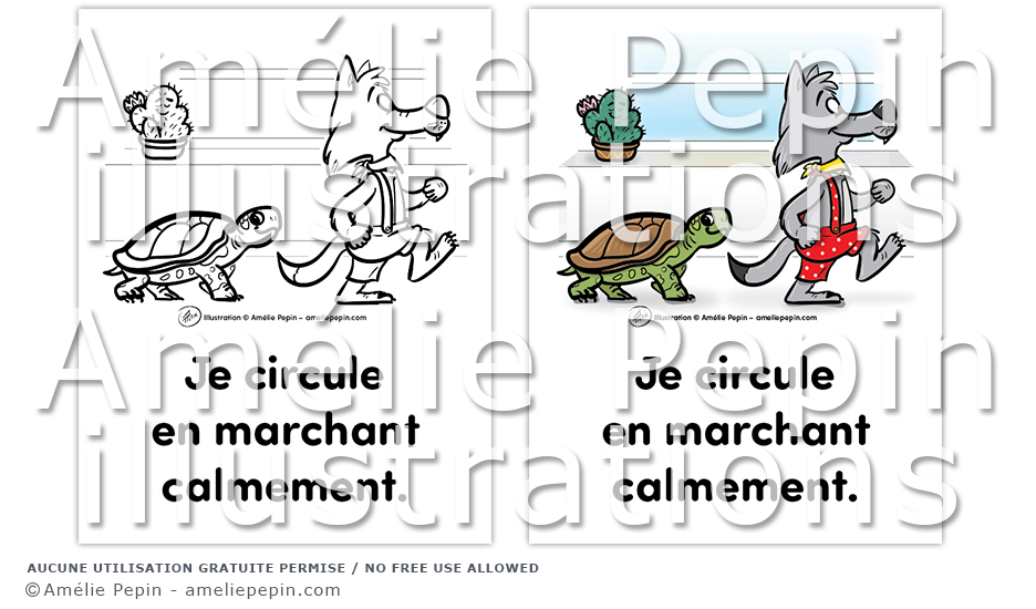 Règle de classe illustrée avec un loup et une tortue: "Je circule en marchant calmement."
