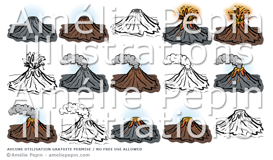 Ce dossier contient 5 modèles de volcans coloriés en deux choix de couleurs (gris ou brun): volcan calme, volcan en éruption, volcan avec de la fumée, volcan avec de la fumée et de la lave, volcan avec de la lave.