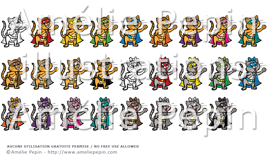 Ce dossier contient des images de chats (garçons et filles) en superhéros de différentes couleurs: rouge, jaune, vert, bleu, orange, violet, rose, turquoise, brun, gris, noir et blanc.