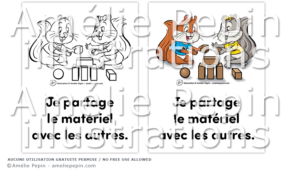 Règle de classe illustrée avec des écureuils: "Je partage le matériel avec les autres."