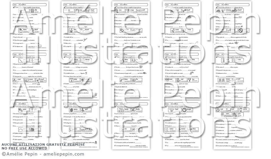 L'enfant écrit le bon mot qui complète chaque phrase. Chaque homonyme est illustré et sa classe de mots est inscrite pour aider les élèves. Il y a cinq phrases par groupe d'homonymes et deux groupes d'homonymes par page (sauf à la dernière page), pour un total de dix questions par page. Les homonymes sont: aile/elle, dans/dent, au/eau/haut, bon/bond, cou/coup/coût, coeur/choeur, boue/bout, cane/canne, champ/chant, cent/sang/sans, cor/corps, cour/cours/court, danse/dense, date/datte, faire/fer, faim/fin, foi/foie/fois, laid/lait/les, moi/mois, maux/mot, pain/pin, par/part, peau/pot, porc/port, tante/tente, vin/vingt, tant/temps, reine/renne/rêne, vair/ver/verre/vers/vert.