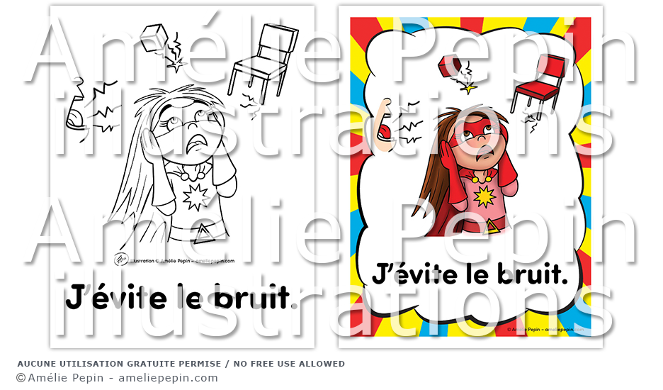 Règle de classe illustrée avec un superhéros: "J'évite le bruit."