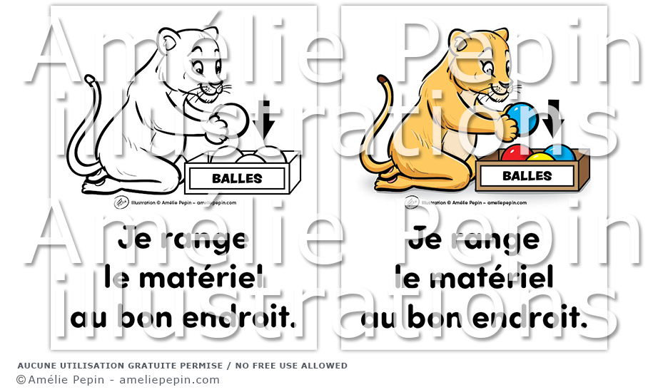 Règle de classe illustrée avec un lionceau: "Je range le matériel au bon endroit."