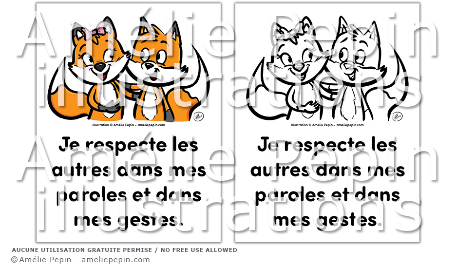Règle de classe illustrée avec des renards: "Je respecte les autres dans mes paroles et dans mes gestes."