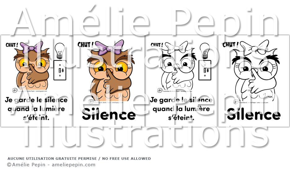 Règles de classe illustrées avec des hiboux: "Silence" et "Je garde le silence quand la lumière s'éteint."
