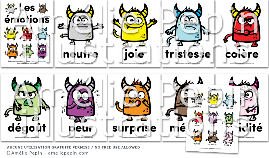Ces affiches illustrent six émotions universelles ainsi que trois émotions en bonus: neutre, joie, tristesse, colère, dégoût, peur, surprise, mépris et timidité.