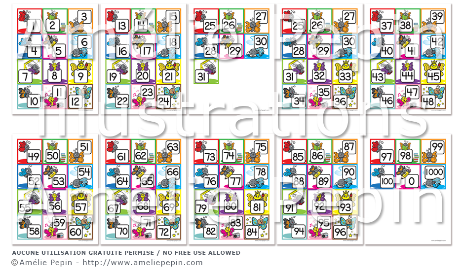 Nombres de 1 à 31 pour calendrier et nombres de 0 à 100 au thème des papillons. Il y a 12 nombres par page.