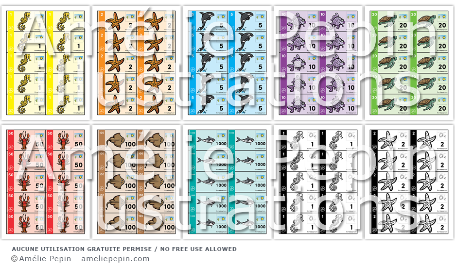 Ces documents contiennent les billets de 1$, 2$, 5$, 10$, 20$, 50$,100$ et 1000$. Sauvez de l'encre en imprimant la version en noir et blanc sur du papier teinté.