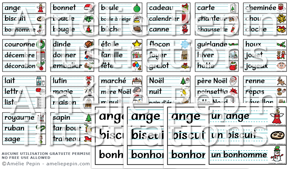 Les mots illustrés sont: ange, biscuit, bonhomme, bonnet, boucle, bougie, boule, boule à neige, bûche, cadeau, calendrier, canne, carte, chanteur, chaussette, cheminée, chou, cloche, couronne, décembre, décoration, dinde, donner, emballer, étoile, famille, fête, flocon, foyer, grelot, houx, guirlande, hiver, hotte, jouet, joyeux, lait, lettre, lutin, magie, maison, marché, mère Noël, minuit, Noël, nuit, pain d'épices, père Noël, poinsettia, pôle Nord, renne, repas, réveillon, royaume, ruban, sage, sapin, tambour, traineau, trompette, vilain, village, lumière, ouvrir, bas.