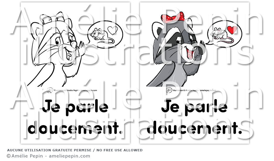 Règle de classe illustrée avec un raton laveur: "Je parle doucement."
