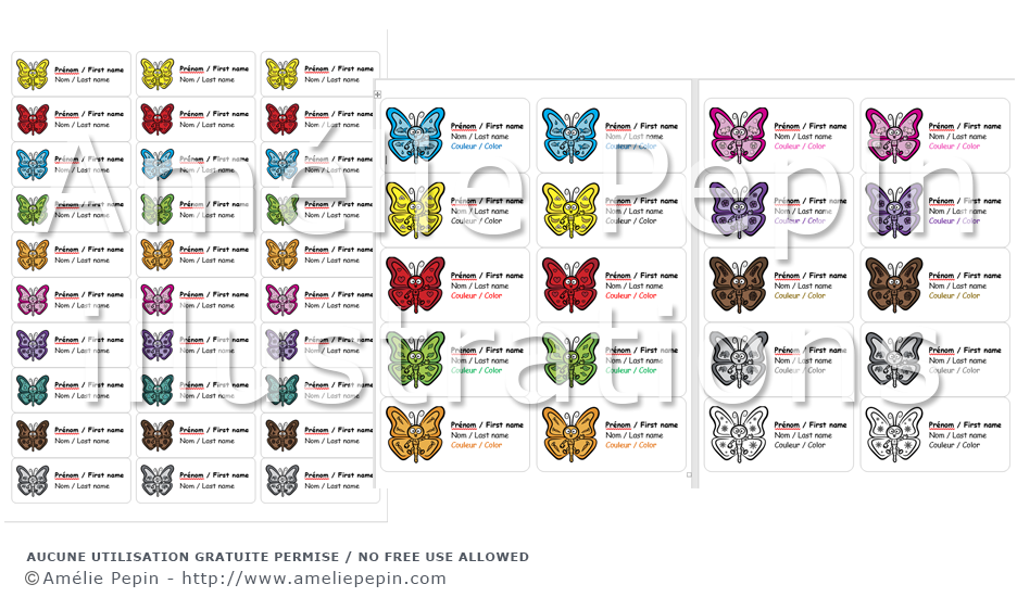 Si vous séparez votre groupe en plusieurs équipes de couleurs, ces étiquettes vous feront sauver du temps pour l'identification de votre matériel. Sous forme de documents Word, vous pouvez insérer le texte de votre choix dans les espaces réservés à cette fin. Il vous suffit alors d'imprimer sur papier Avery 5160 ou 5163 selon le document choisi.