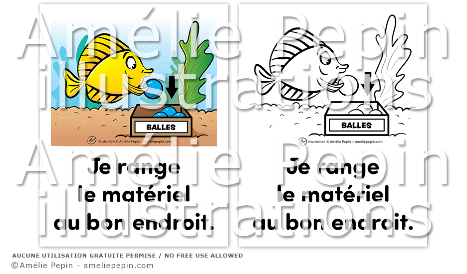 Règle de classe illustrée avec un poisson: "Je range le matériel au bon endroit."