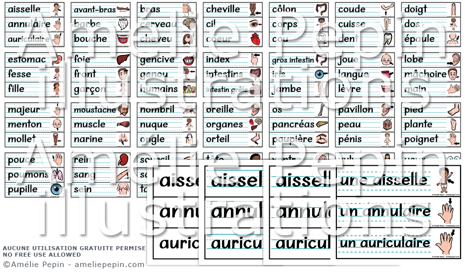 Les mots illustrés sont: aisselle, annulaire, auriculaire, avant-bras, barbe, bouche, bras, cerveau, cheveu, cheville, cil, coeur, côlon, corps, cou, coude, cuisse, dent, doigt, épaule, estomac, fesse, fille, foie, front, garçon, gencive, genou, humains, index, intestins, intestin grêle, gros intestin, iris, jambe, joue, langue, lèvre, lobe, mâchoire, main, majeur, menton, mollet, moustache, muscle, narine, nombril, nuque, ongle, oreille, organes, orteil, os, pancréas, paupière, pavillon, peau, pénis, pied, plante (du pied), poignet, pouce, poumons, pupille, rein, sang, sein, sourcil, squelette, talon, tête, torse, vaisseaux, ventre, vessie, visage, vulve, nez, oeil, yeux.