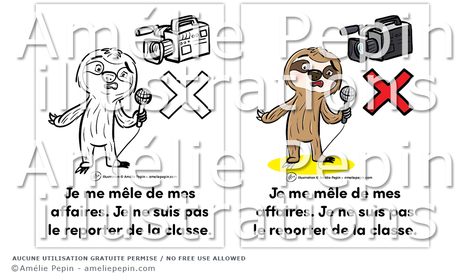 Règle de classe illustrée avec un paresseux: "Je me mêle de mes affaires. Je ne suis pas le reporter de la classe."