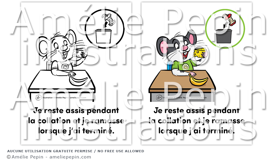 Règle de classe illustrée avec une souris: "Je reste assis pendant la collation et je ramasse lorsque j'ai terminé."