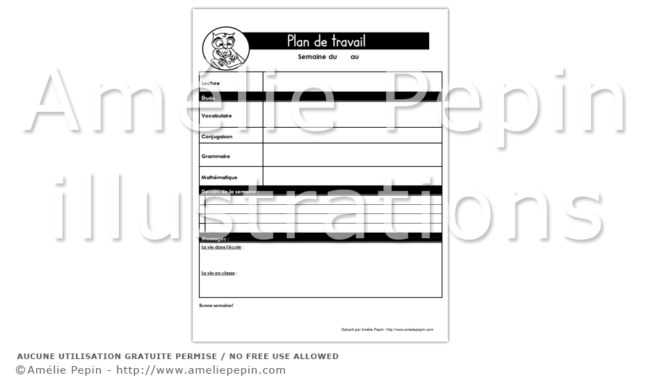 *Afin d'ouvrir le document, vous devez avoir le logiciel Microsoft Word. Vous pouvez modifier le tableau et écrire dans les champs de texte. À noter que le titre "Plan de travail" et l'illustration forment une image et qu'ils ne sont pas modifiables. Thème des hiboux.