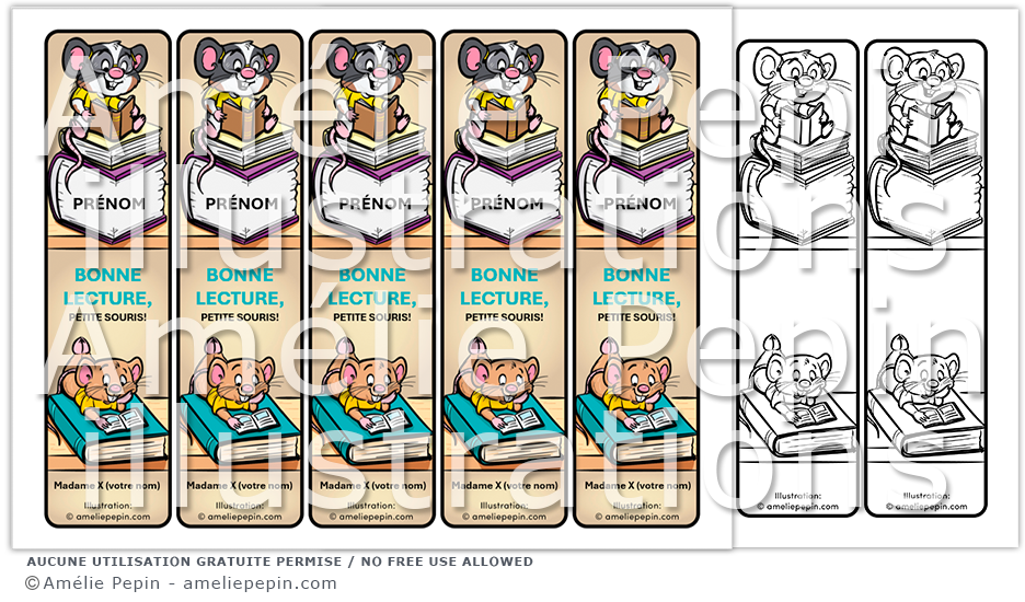 Signets aux coins arrondis illustrés avec deux souris qui lisent leur livre passionnément. Le texte suggéré que vous pouvez changer sur le signet est: «Bonne lecture, petite souris!».