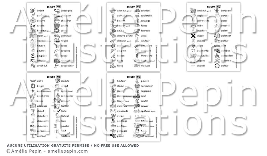 Ce document de cinq pages comporte une liste de 120 mots illustrés en noir et blanc qui contiennent le son AU. L'élève peut surligner le son AU dans chaque mot pour un meilleur apprentissage.