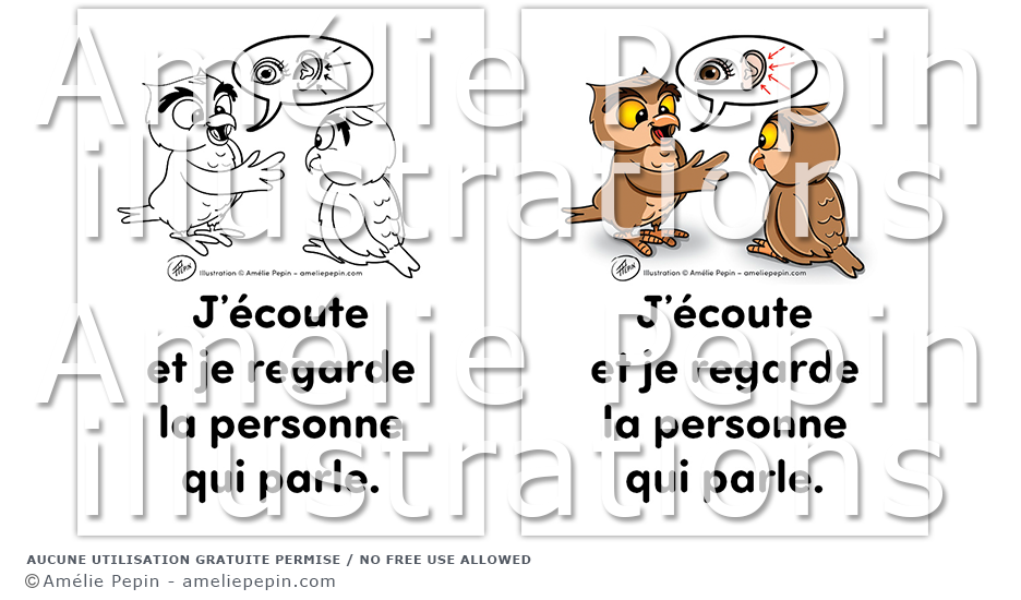 Règle de classe illustrée avec des hiboux: "J'écoute et je regarde la personne qui parle."