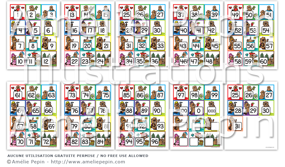 Nombres de 1 à 31 pour calendrier et nombres de 0 à 100 au thème des castors. Il y a 12 nombres par page. Cliquez sur le bouton "Aperçu" afin de visualiser les pages.